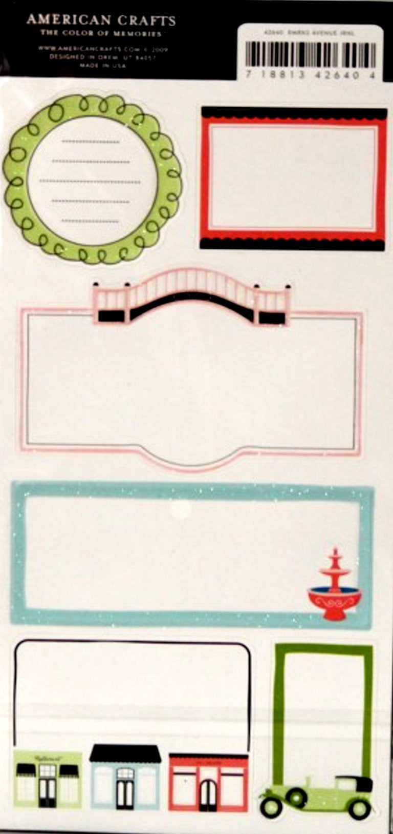 This is a 12 piece set of American Remarks Glitter Journaling Stickers called "Avenue". These stickers are great to record your favorite moments and embellish cards, tags, scrapbook pages or use on any other project. This package measures approximately 4" x 9" just peel and stick and you are done!