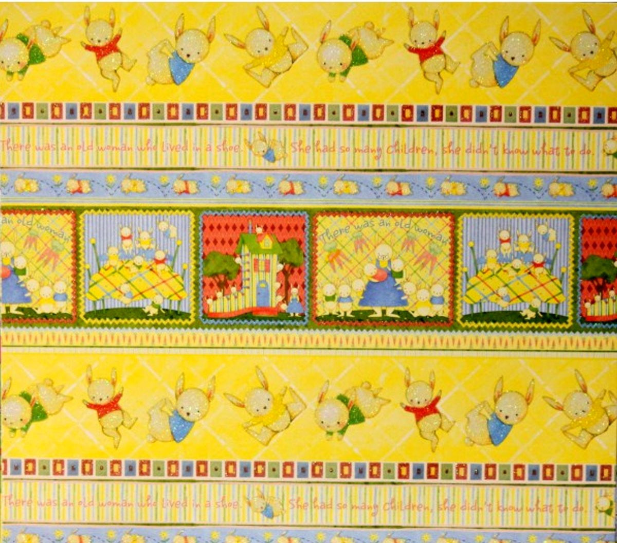 This is a sheet of 12" x 12" DCWV Heat Embossed Old Lady In A Shoe Nursery Rhymes Cardstock Scrapbook Paper. This paper is great to make baby scrapbook pages, cards, tags or any other project and is considered a specialty paper because it is embossed with a raised surface.