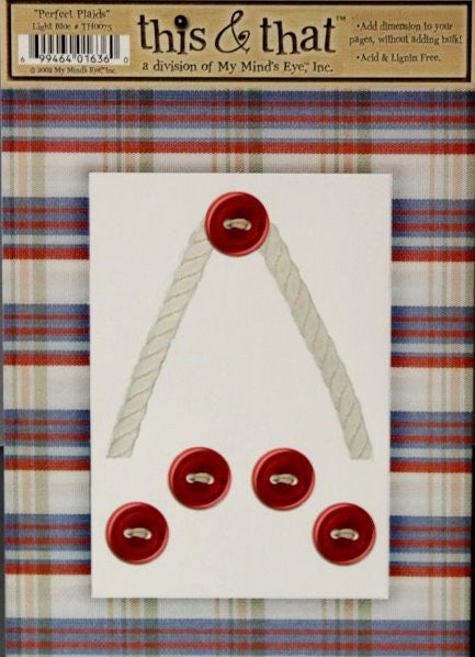 This is a "Perfect Plaids Light Blue" Die-Cut Cardstock "This & That" Frame & Embellishments sheet by My Mind's Eye. This frame and embellishments is great to embellish scrapbook pages, cards, or any other project and measures approximately 5" x 7.25. This sheet contains 1 frame and 5 embellishments.
