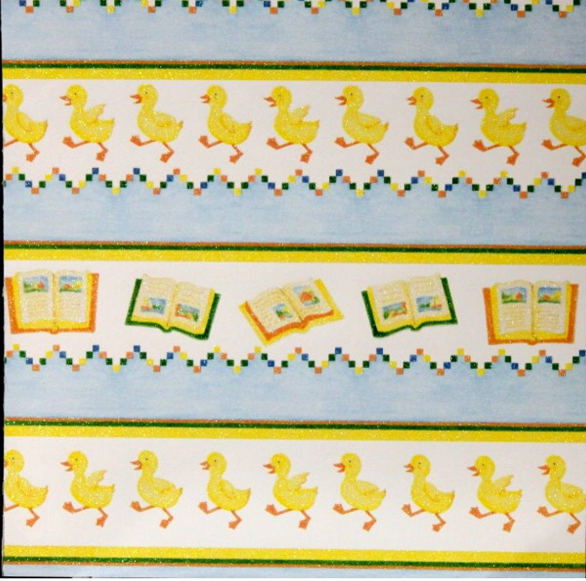 This is a sheet of 12" x 12" DCWV Heat Embossed Baby Ducks In A Row Nursery Rhymes Cardstock Scrapbook Paper. This paper is great to make baby scrapbook pages, cards, tags or any other project and is considered a specialty paper because it is embossed with a raised surface.