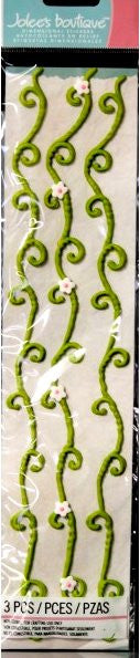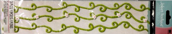 This is a pack of EK Success Jolee's Boutique Green Floral Icing Borders Stickers. These stickers are dimensional and have the look and feel of real icing and have an adhesive backing and are ready for you to use on cards, tags, scrapbook pages or any other project. This package measures 3" x 13.75" and contains 3 pieces. Just peel and stick and you are done.