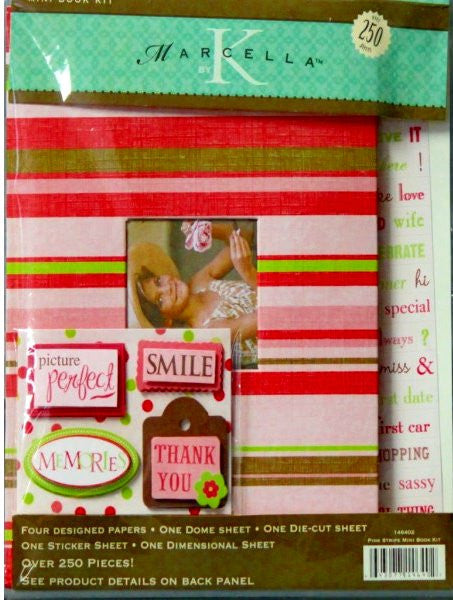 This "Pink Stripe" Mini Scrapbook Kit is brought to you by Marcella K of K & Company. This item is acid and lignin free and includes a hardcover mini album, 4 papers, one dome sheet, one die-cut sheet, one sticker sheet, and one dimensional sheet totalling over 250 pieces. This book is ready for you to decorate and measures approximately 7" x 9".