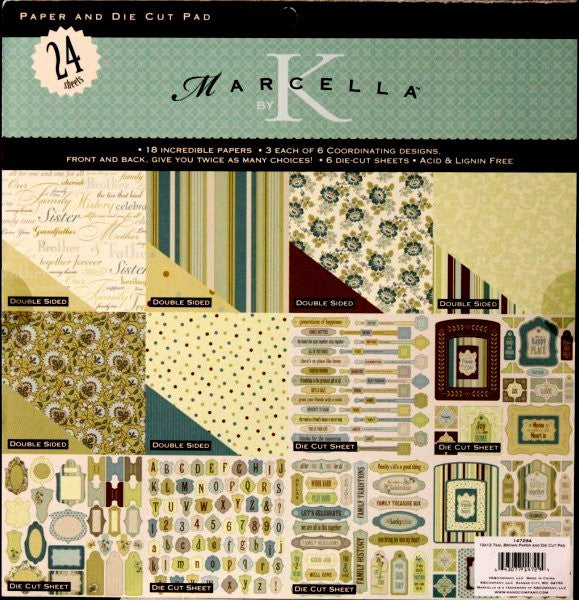 This is a K & Company Marcella K Teal Brown Paper and Die Cut Pad. This pad contains (24) 12" x 12" sheets, 3 each of 6 coordinating designs, and 6 die-cut sheets full of coordinating embellishments. This paper is great to make cards, tags, scrapbook pages, or any other project.