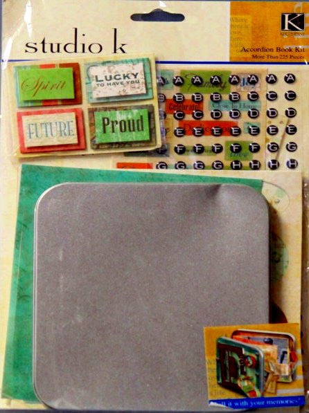 This Studio K Mini Breeze Accordion Book Kit in Metal Tin is brought to you by K & Company. This item is acid and lignin free and includes more than 225 pieces and is ready for you to decorate. This package measures approximately 7" x 10".