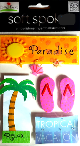 This is a pack of Me & My Big Ideas Soft Spoken Ellen Krans Tropical Vacation Dimensional Stickers. These stickers are great to embellish scrapbook pages, cards, tags, shadow boxes, planners, journals, office, home, school or can be used on any other project and measures approximately 4.50" x 7.75. Just peel and stick and you are done. These stickers are perfect for travel, vacation, destination, school, Family, Heritage and everyday projects.