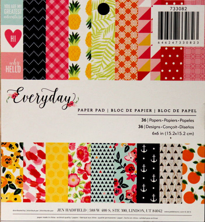 This is a Pebbles Jen Hadfield Everyday 6" x 6" Scrapbook Paper Pad. This pad contains 36 single-sided cardstock papers which are perfect to create scrapbook pages, cards, tags or any other project. The designs in this pad are featured on the front cover of this product listing.