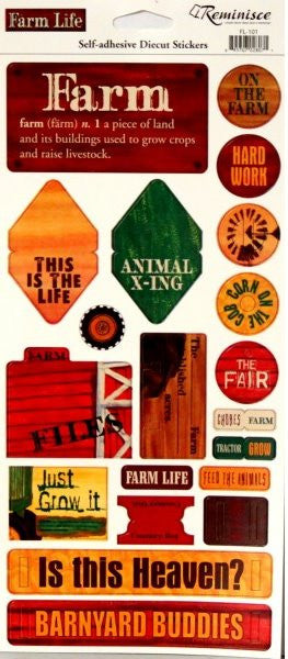 This is a Reminisce Farm Life Self-Adhesive Diecut Stickers sheet. These stickers are great to embellish cards, tags, scrapbook pages or any other project and measures approximately 4.50" x 10.25". Just peel and stick and you are done.